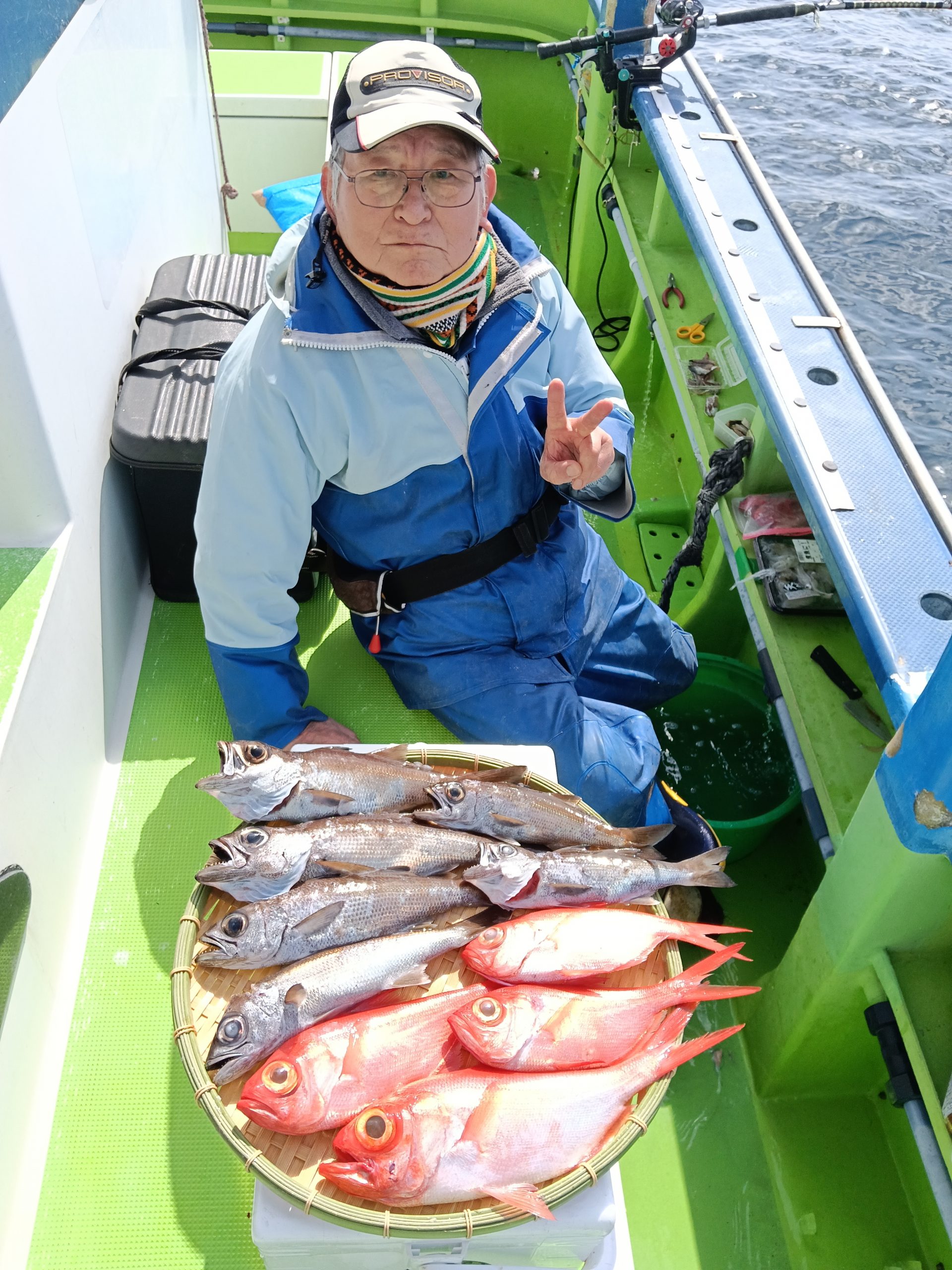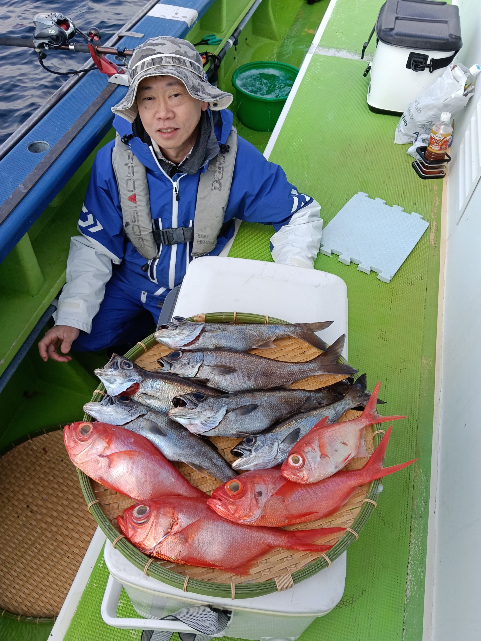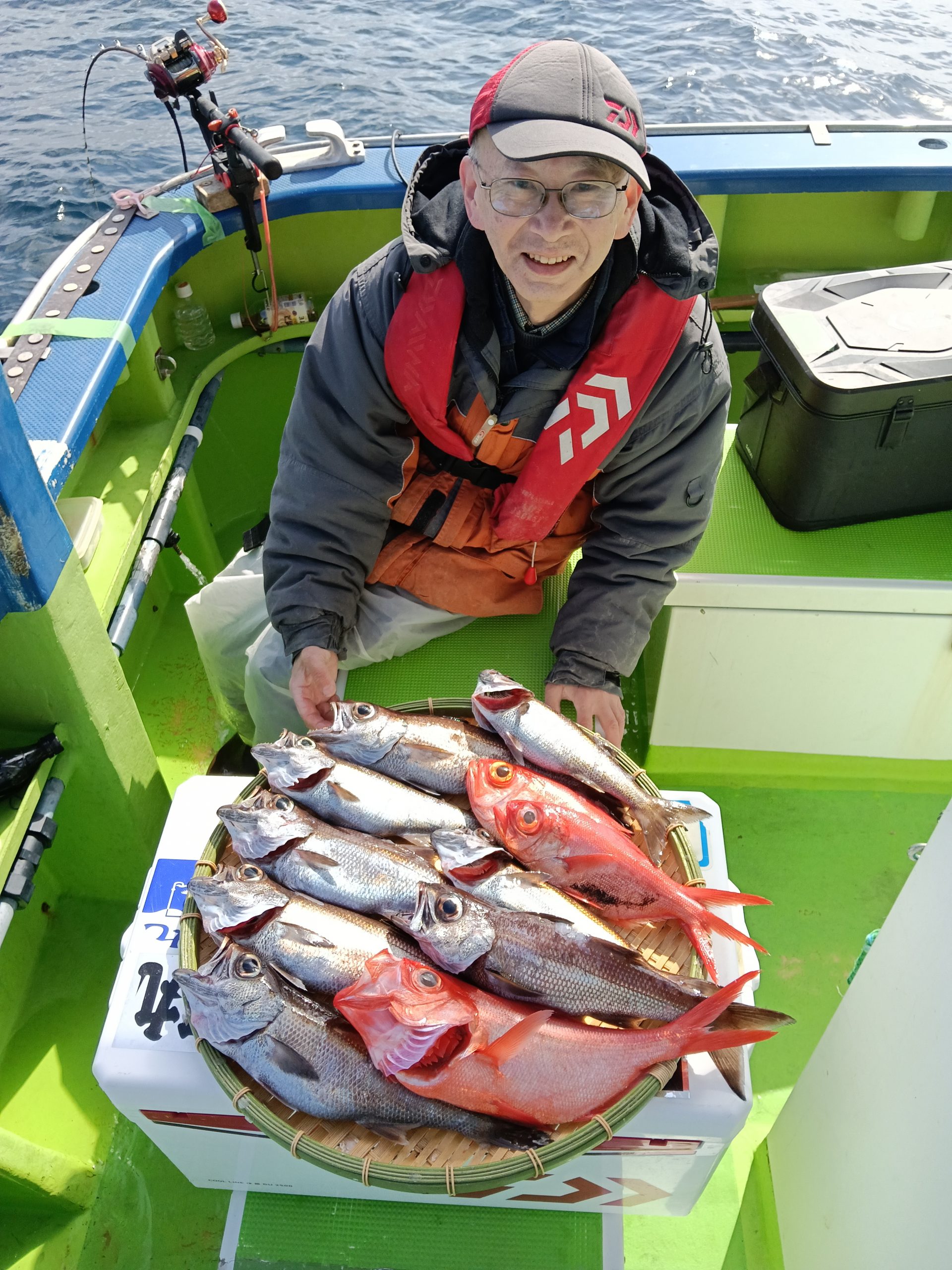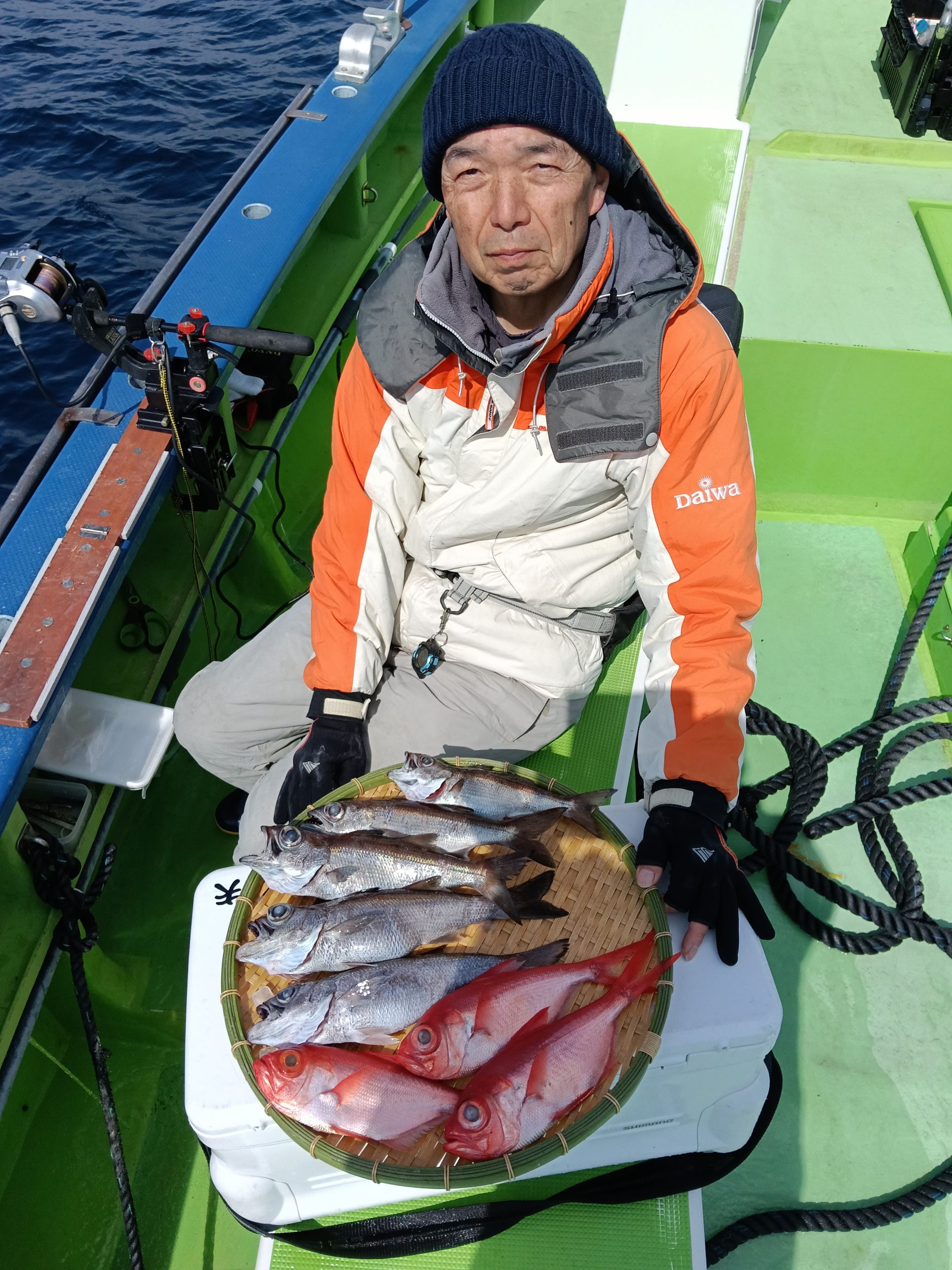 7日(土)は朝集まっていただきましたが爆風により出船中止。ごめんなさい。8日(日)は良いナギ予報です。根魚五目船(キンメ、ムツ)で出船しますのでよろしくお願いいたします。良い魚釣れてます!!6日(金)釣果→根魚五目船(キンメ、ムツ)です。前半戦の浅場ではキンメにムツのアタリ良く3時間の大流しにて釣れた!!後半戦は深場へと展開しラストの流しにてアコウダイ3.8キロ浮上(ルアー)他に良型のキンメも!!結果【キンメTOP8枚、ムツTOP14本】皆さまお土産はバッチリ確保できました。8日(日)根魚五目船、良い陽気なのでお待ちしてます。9日(月)アジ、サバ船(スポット)コマセきかないで皆さまお待ちしてます!!
