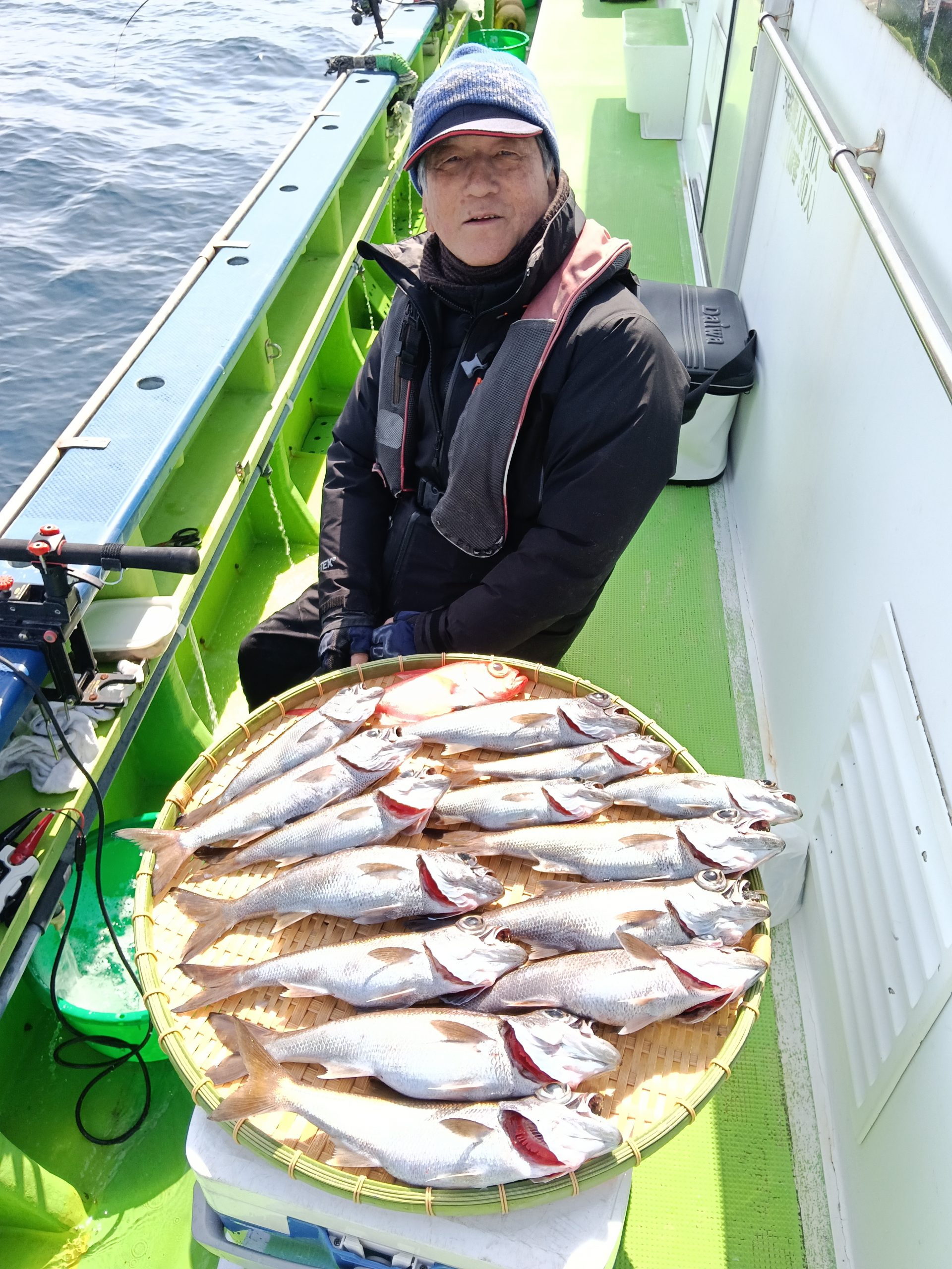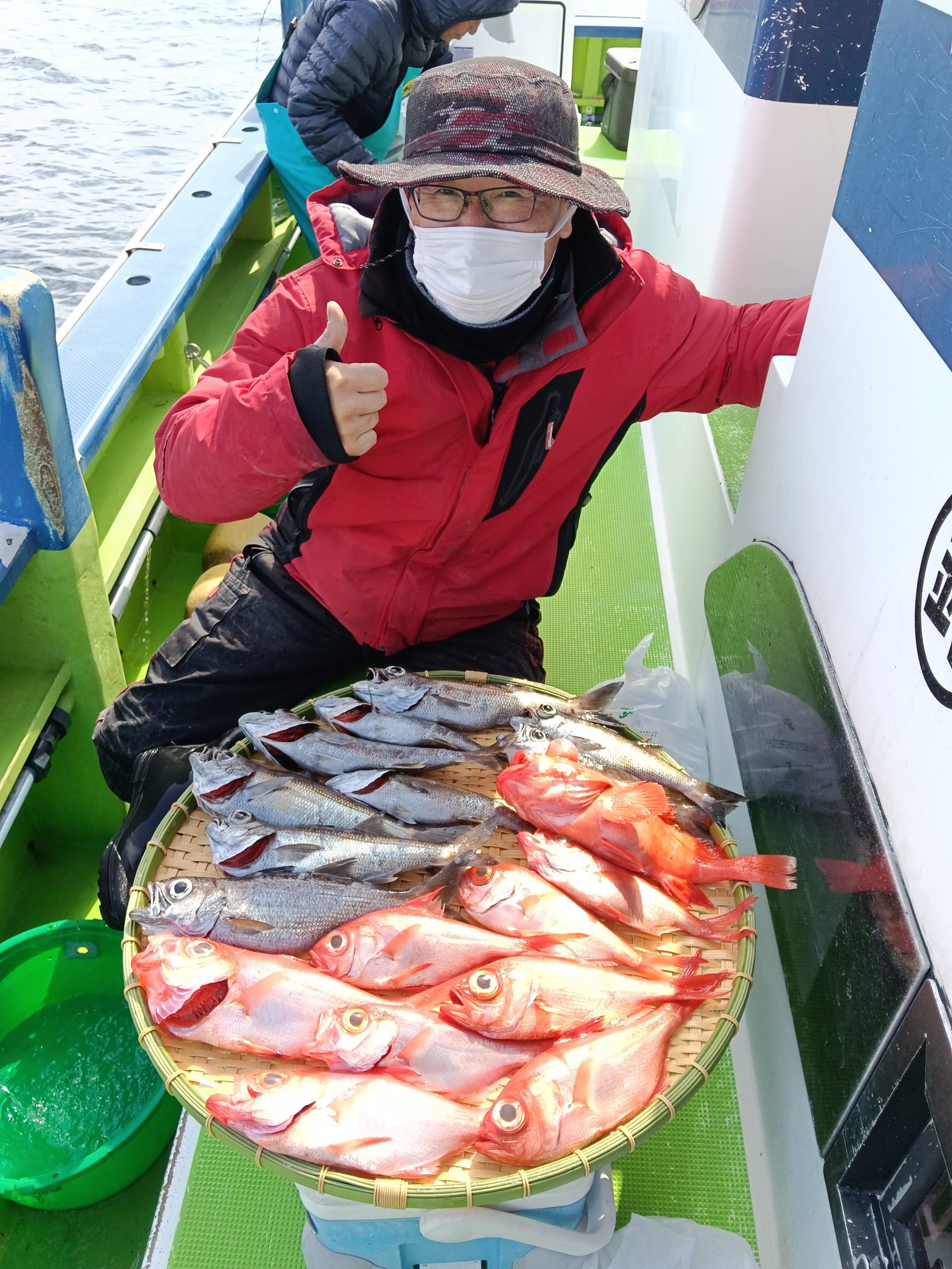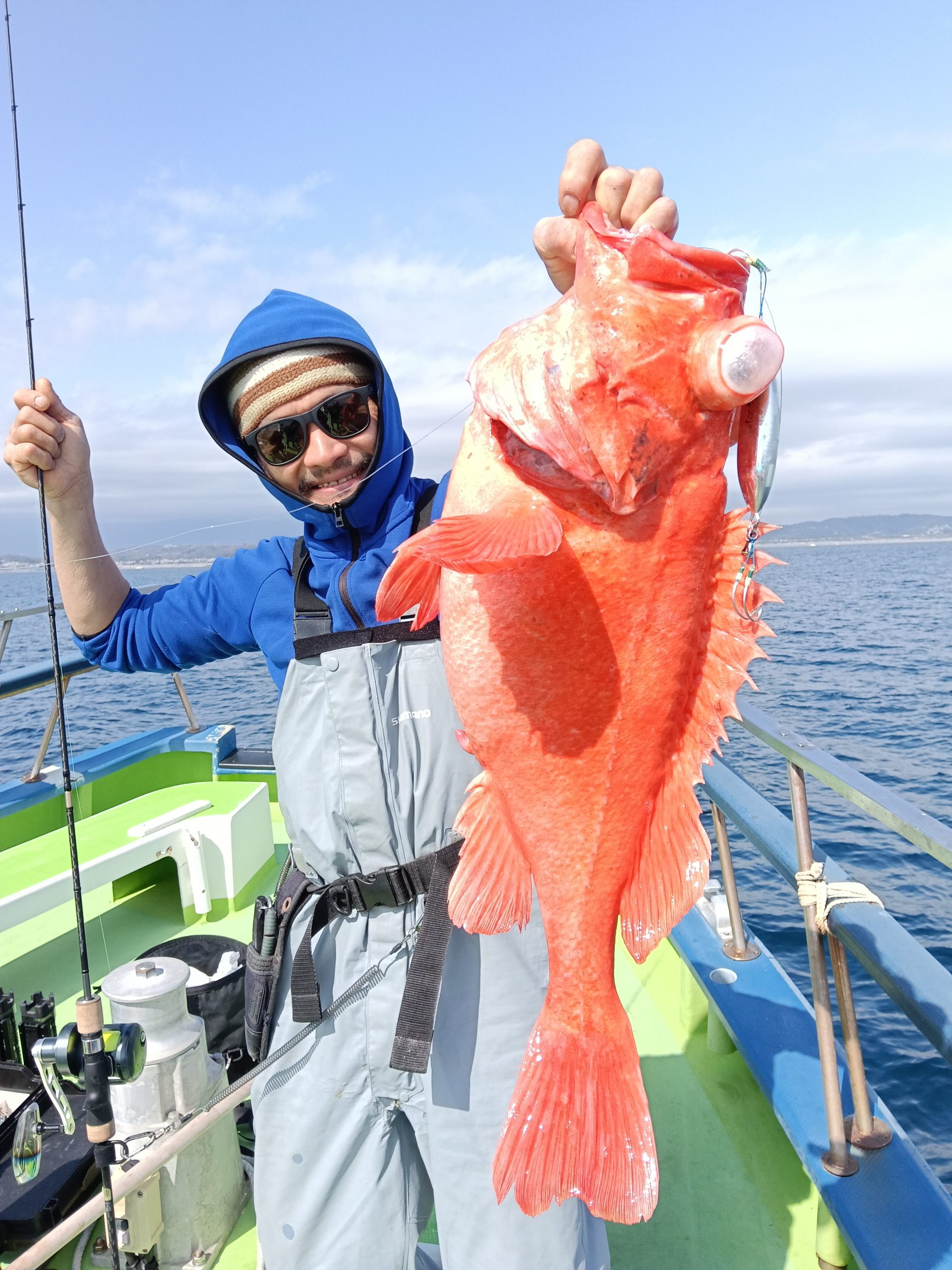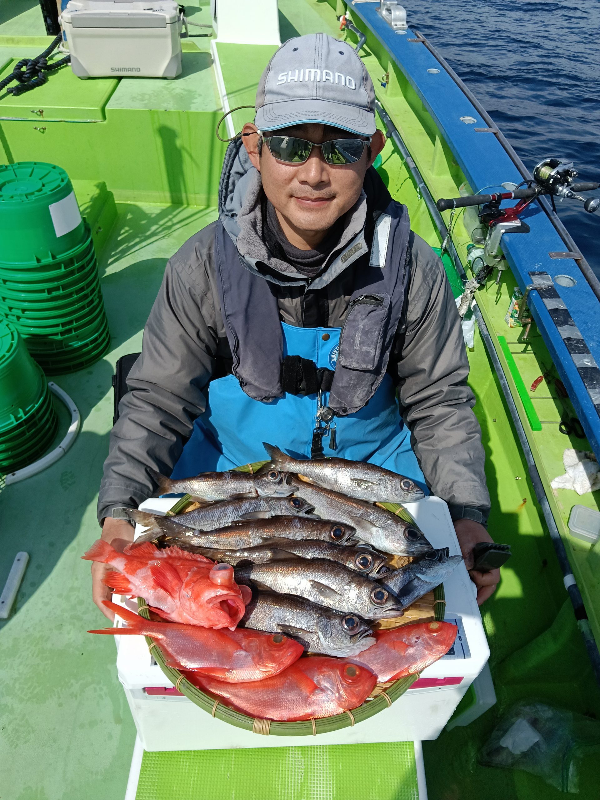 7日(土)は朝集まっていただきましたが爆風により出船中止。ごめんなさい。8日(日)は良いナギ予報です。根魚五目船(キンメ、ムツ)で出船しますのでよろしくお願いいたします。良い魚釣れてます!!6日(金)釣果→根魚五目船(キンメ、ムツ)です。前半戦の浅場ではキンメにムツのアタリ良く3時間の大流しにて釣れた!!後半戦は深場へと展開しラストの流しにてアコウダイ3.8キロ浮上(ルアー)他に良型のキンメも!!結果【キンメTOP8枚、ムツTOP14本】皆さまお土産はバッチリ確保できました。8日(日)根魚五目船、良い陽気なのでお待ちしてます。9日(月)アジ、サバ船(スポット)コマセきかないで皆さまお待ちしてます!!