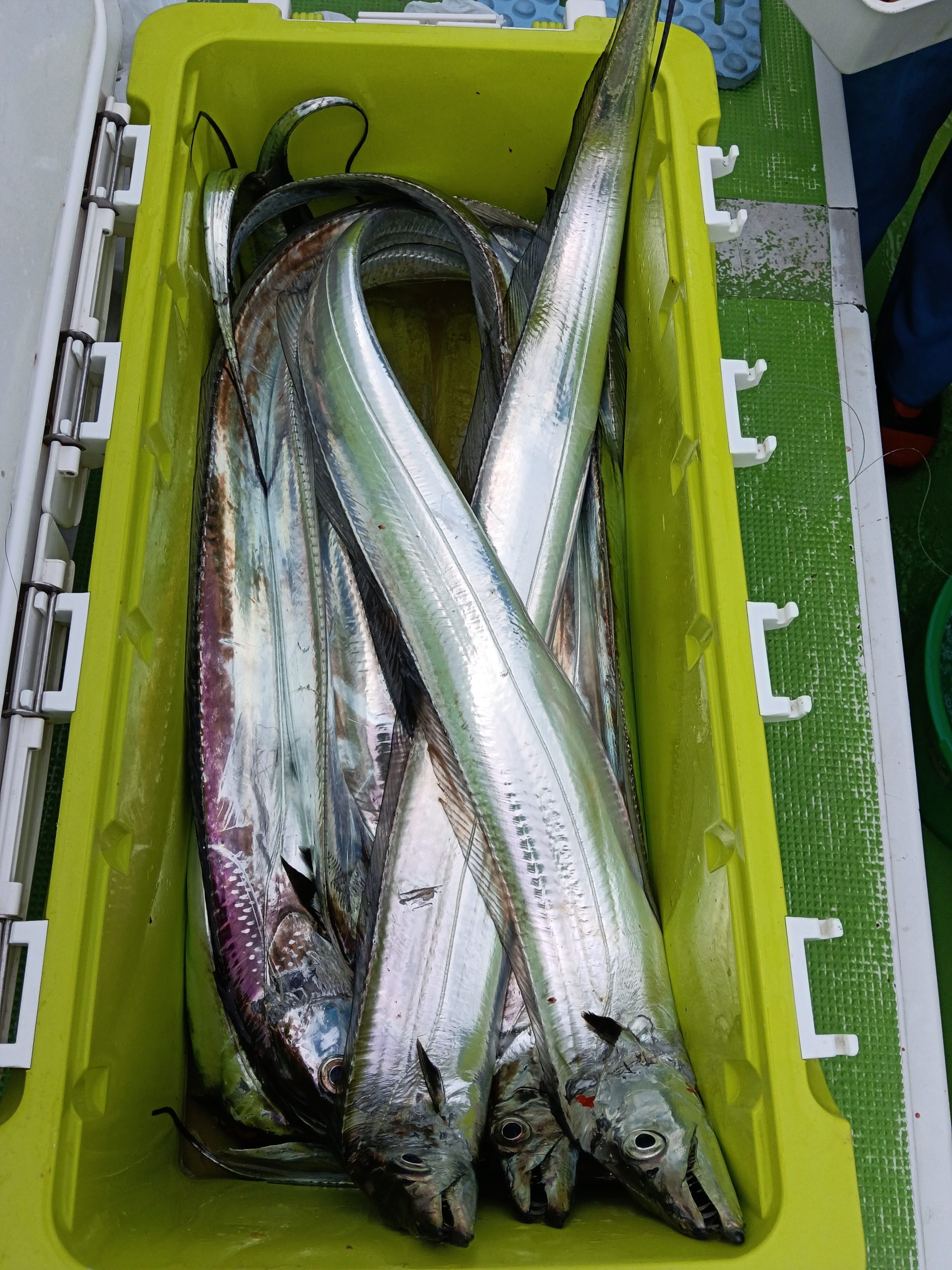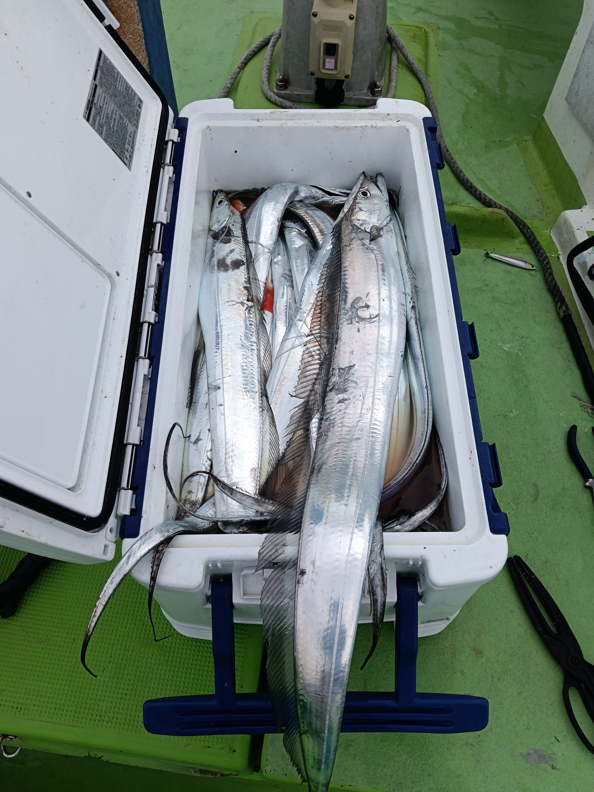 本日は【タチウオ船】です。浅場(30m)にて【天秤、テンヤ、ルアー】共にドラゴン級タチウオ釣れました!!浅いだけに食ったら強烈なひきを堪能できましたね。結果、【天秤、テンヤ】最大6.5本指でドラゴン級多くTOP26本!!【ルアー】ドラゴン級多く14本〜27本!!24日(火)は定休日、25日(水)タチウオ船で出船しますのでよろしくお願いします。天秤、テンヤ、ルアー、お好きなスタイルでどうぞ!!そして、早めの釣行をオススメします!!